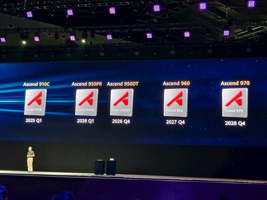 当天,华为副董事长、轮值董事长徐直军宣布了多颗昇腾系列芯片和演进路线,包括昇腾950系列、昇腾960系列和昇腾970系列。他表示,预计华为2026年第一季度推出昇腾950PR芯片,第四季度推出昇腾950DT,2027年第四季度推出昇腾960芯片,2028年四季度推出昇腾970芯片。